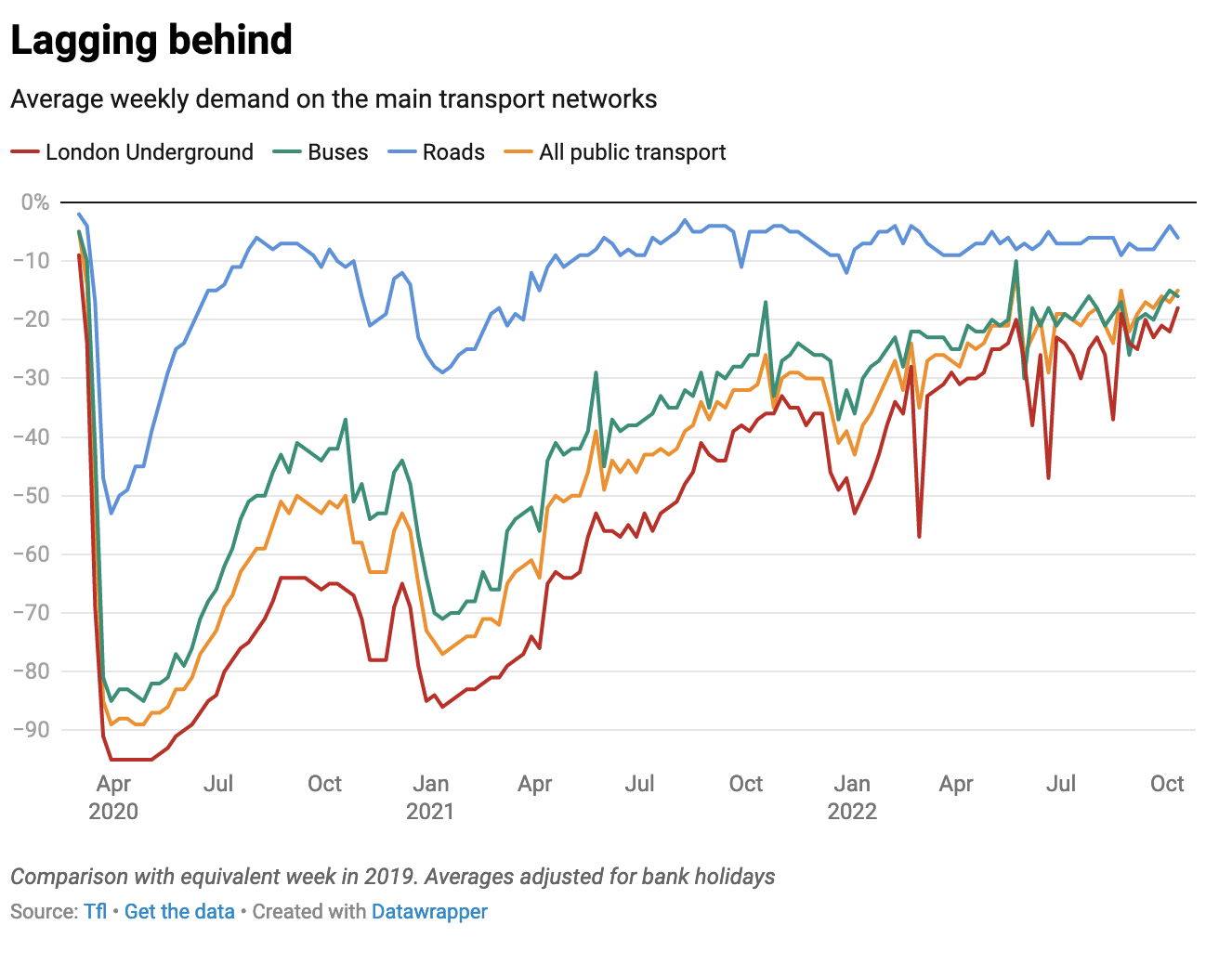 But the fact that road traffic levels have recovered faster than public transport use suggests that changes in work patterns have hampered a shift to ‘greener travel’. When people do leave their homes, whether for work, leisure or shopping, it seems they are more inclined to do so by car. Indeed, the kind of jobs which cannot be done from home – such as nursing, caring or building trades – tend also to be the ones which are hard to do by public transport.