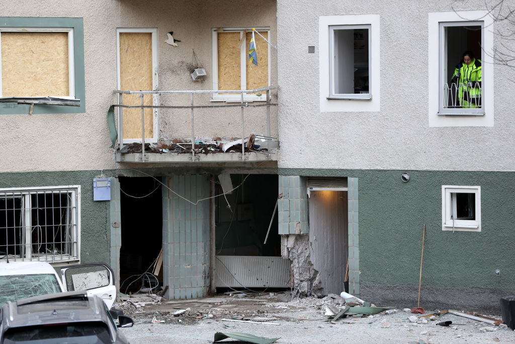 Aftermath of a gang-related bomb explosion in Stockholm, Sweden, 2 February 2024 (Getty Images)
