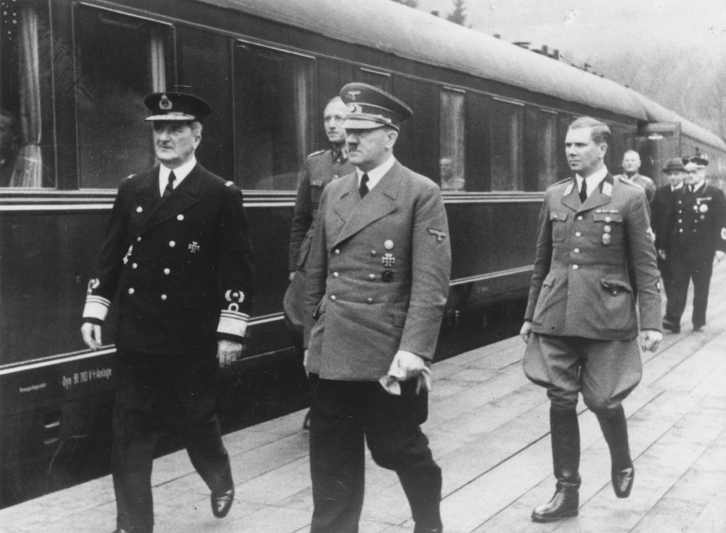 Adolf Hitler with Hungarian Admiral Horthy and Nazi party leader Martin Bormann. (Photo by Keystone/Getty Images)
