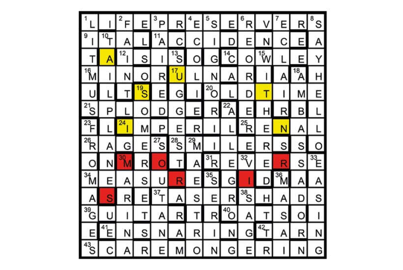 The unclued Across lights are makes of AUSTIN (in yellow) cars and the unclued Down lights are MORRIS (in red) cars, hence A and M in the title.