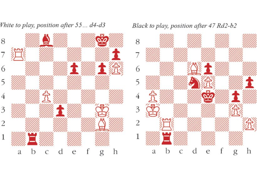 47…Rxb2 48 Kxb2 Kf3 A shocking but brilliant decision. White’s apparent lead in the race to promote a pawn is illusory. 49 a5 This natural move loses. Retreating the bishop was essential, e.g. 49 Kb3! Kg2 50 Bb4 Kxh2 51 Be1 Kg2 52 Kc2 Kf1 53 Kd2 is awkward but good enough for a draw. Kg2 50 a6 Kxh2 51 a7 Nb6 52 Bc5 Na8 53 Bf2 Kg2 54 Be1 Kf1 55 Bd2 Kf2 56 Bf4 Kf3 h5-h4 cannot be stopped. White resigns/>