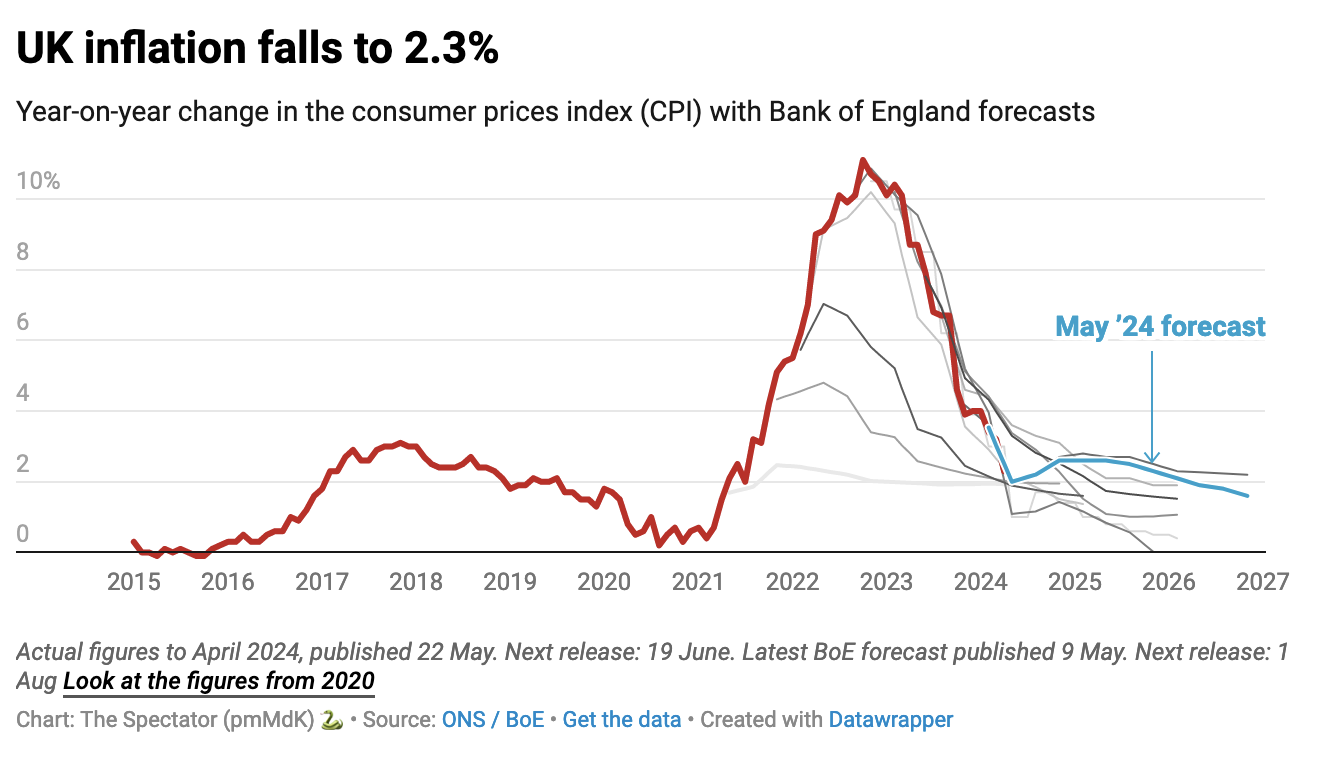 It’s one of the big sacrifices Sunak made when he decided to call an election this side of the year. Had he waited until autumn, we would have likely been able to cite at least one, if not two, rate cuts, and also very likely a healthier economy that was outperforming the current forecasts (as Katy Balls writes for this week’s magazine, worries over the Rwanda scheme and what it might mean for Britain’s standing in the ECHR are thought to have sped up the election timeline). It’s a big gamble he’s taken: not only might the economy tell a better story in six months, but there is a chance that a Labour government will be taking credit for a rosier picture, even if they have only recently entered Downing Street.