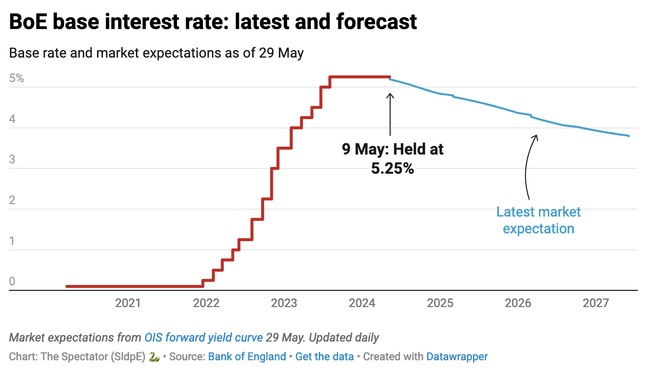 Indeed the best chance of linking the Tories to a rate cut would have been for a cut to actually have been delivered on their watch – an event that is now certain to be delayed until after the election. Markets continue to expect a few interest rate cuts before the end of the year (tracked by The Spectator’s data hub below), which are forecast to start over the summer. But similar to the Federal Reserve in the United States, central banks must avoid accusations of playing politics at all costs. This means that they will stick with the status quo (i.e. holding rates) until after their respective elections. While the prospects of a June rate cut in the UK were already starting to slip, it’s now guaranteed that there will be no start to the process until at least August.