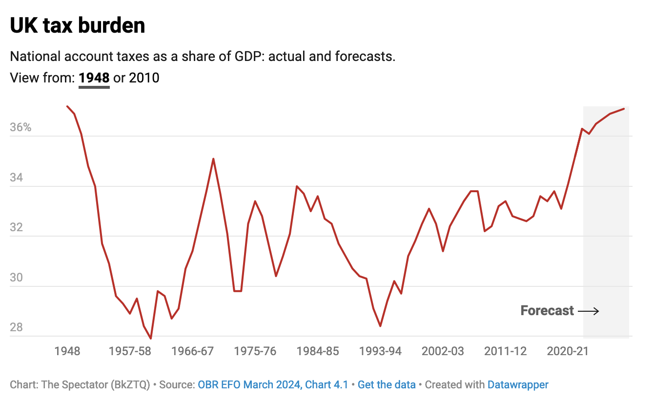Of course there are factors that the Tories can control and take ownership of – the tax burden included. Speaking to the Times, Sunak committed to ‘lower the tax burden’ were his party to win re-election. But as the Tories have found for the better part of two years now, the tax narrative is not playing in their favour as it so often does – likely because the overall tax burden has been rising on Sunak’s watch, on track to nearly reach a post-war high.