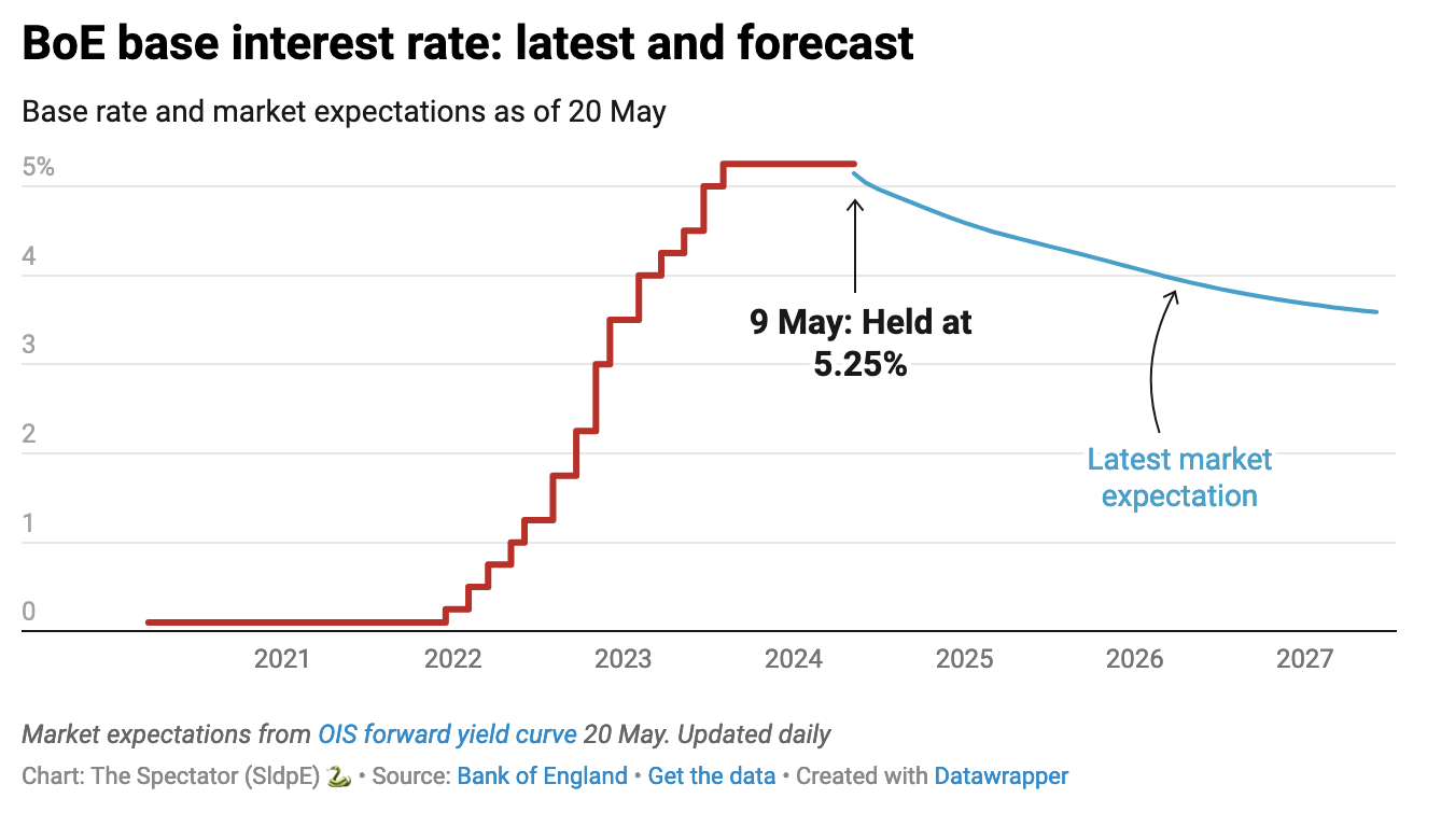 We learn more about that evolution tomorrow, when the inflation data for April is published. It’s a big update: the headline inflation rate is expected to slow to (or around) the Bank’s target of 2 per cent, marking the end of the inflation crisis that has plagued the country since autumn 2021. The BoE does expect the rate to pick up slightly towards the end of the year, but nothing compared to what’s happened the past few years. Having acknowledged on multiple occasions now that a rate cut is compatible with keeping monetary policy fairly restrictive, tomorrow’s inflation update should be another indicator to the Bank that it can start a slow and steady process of cutting rates.