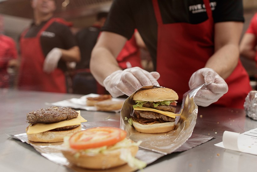Five Guys is a burger house from Arlington, Virginia, based on the premise that if you can serve a drink, cut a fringe, or make a hamburger, you will always make money in America. Thirty years and 1,700 restaurants later, it sits on Coventry Street off Piccadilly, soaking up the alcohol of a thousand British stomachs. If central London is a strip-lit bin alley between palaces, this is its restaurant: vital but fraying.