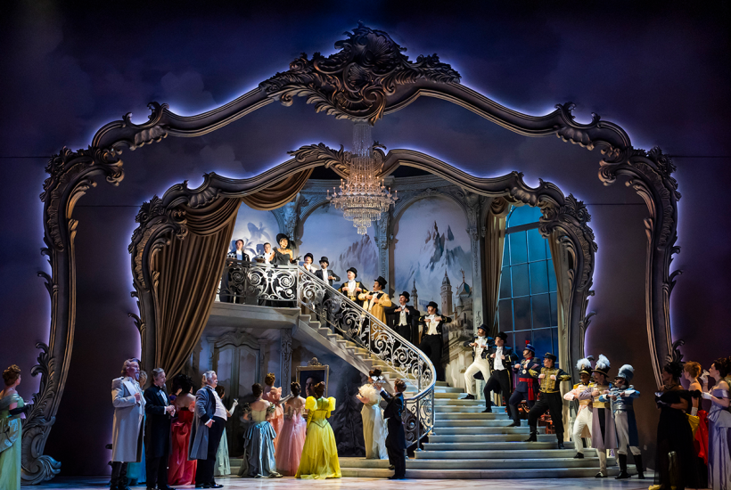 I didn’t manage to check the Glyndebourne gift shop, but there was never much likelihood of them selling the Widow short. Cal McCrystal’s new staging is a sugar rush for the eyes; a gorgeous, rose-tinted swirl of belle-époque opulence, framed (thanks to Gary McCann’s designs) in an ornate silver frame that doubles as a cinema screen. The cast and titles are projected as the Prelude plays (it’s performed in English, by the way), as if we’re about to watch some classic movie musical. Men in gold braid and tailcoats line a grand staircase, doffing their hats in unison. Mist cascades downstage as Hanna (Danielle de Niese) and Danilo (German Olvera) sing a moonlit love duet. You get the idea: McCrystal has said that he had MGM in mind, and he delivers in spades.