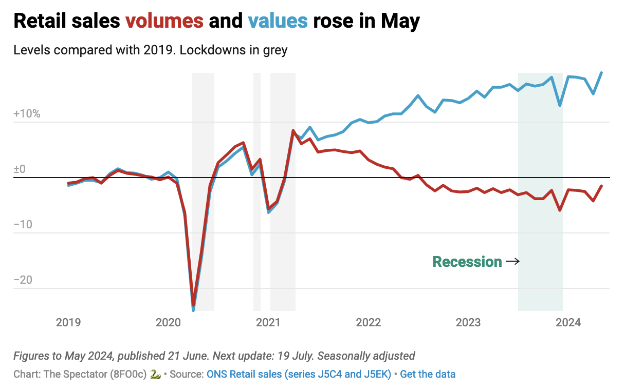 As for the sales figures themselves, they are not as dramatic as they might at first appear. Rather, the plunge in sales in April, followed by the sharp rise in May, shows how volatile these statistics are. The Office of National Statistics (ONS) seasonally-adjusts them, yet these figures also depend on how the dates fall: some months have four weekends and others five, which must make something of a difference. Looking at the wider picture, sales volumes increased by 1.0 per cent in the three months to May, but were still 0.2 per cent down on the same period in 2023. Textile and clothing sales did particularly well in April, rising by nearly 10 per cent, while household goods sales were flat.
