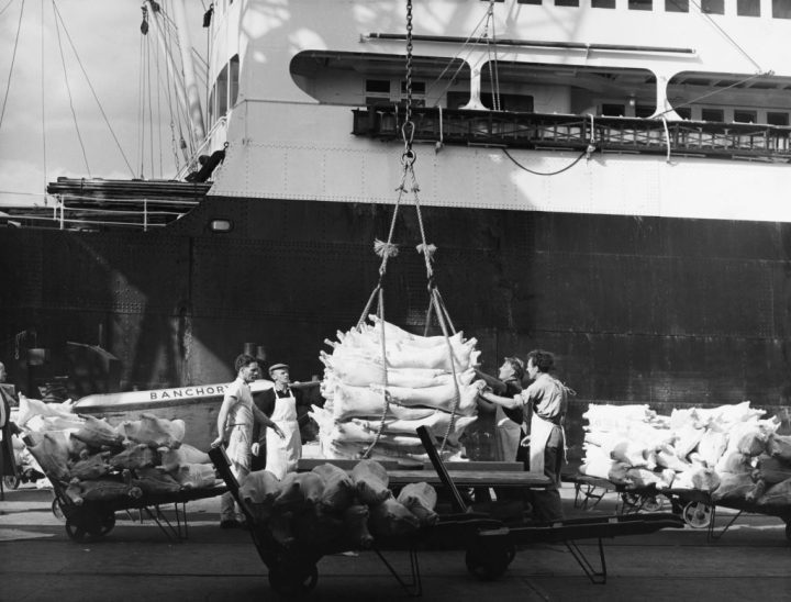 Dockworkers guiding a load onto the quayside at the Port of London docks (Credit: Getty images)