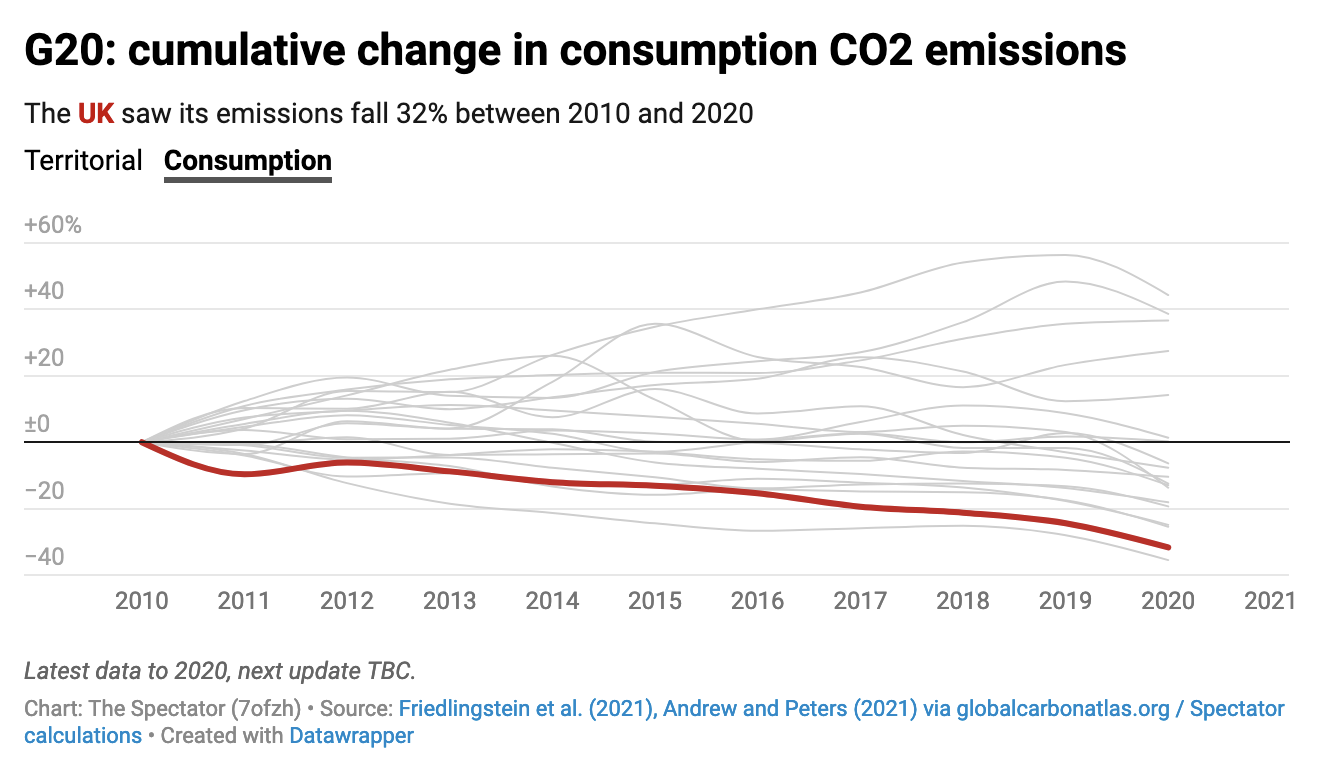 On climate, Farage didn’t trash net zero like he might have done but sought to advocate a Sunak-style third way. We’re pursuing completely unrealistic climate policies, he said: Labour have pledged to decarbonise the grid by 2030, and the Tories ban buying diesel cars by 2035. If we get new technologies to give us cheaper energy, that’s great – but we’re sacrificing economic growth and destroying British manufacturing. He was wrong to say that we haven’t reduced carbon emissions more than any western countries, and that we’ve exported them to India and China. I wish Mordaunt could have picked him up on this: even if you look at consumption (rather than territorial) the UK does better than any G20 country other than Italy (as The Spectator data hub tells you). But his overall line is, again, very similar to that we have advanced in The Spectator’s leader columns over the years.