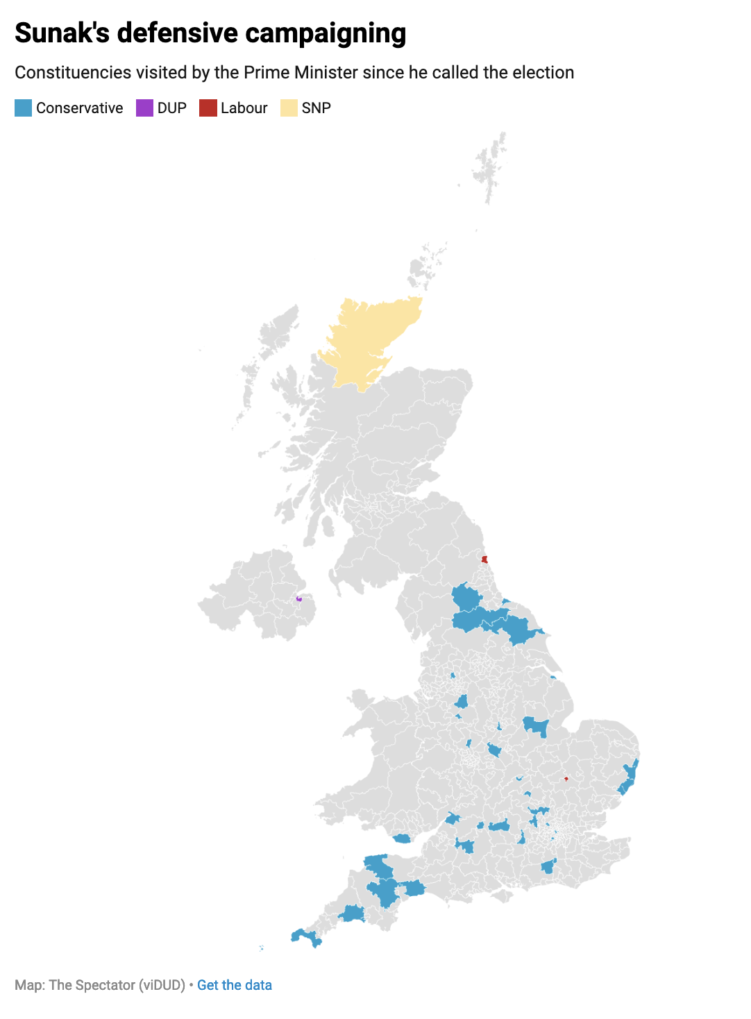 Over the first four weeks of the general election campaign, Sunak has so far personally made his way around 37 constituencies across the UK. With less than two weeks to go until the national poll, the Prime Minister has only ventured out of England on three occasions, and made just four trips to non-Conservative held seats. It suggests that he is is running a rather defensive campaign amid complaints that he has ‘abandoned’ the red wall. So where has Sunak gone so far?