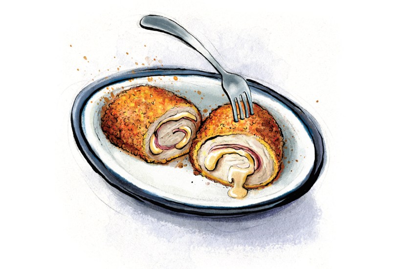 Like its more famous cousin, the chicken Kiev, chicken cordon bleu enjoyed its heyday at 1970s dinner parties. Unlike the Kiev, it didn’t enjoy the same revival as comfort or convenience food. Perhaps it’s because the gentle ooze of cheese is not as show-stopping as the spurt of garlic butter. But that is to its advantage: there is nothing sadder than cutting into a chicken Kiev and finding it hollow; the more robust cheese and ham filling poses much less of a risk.
