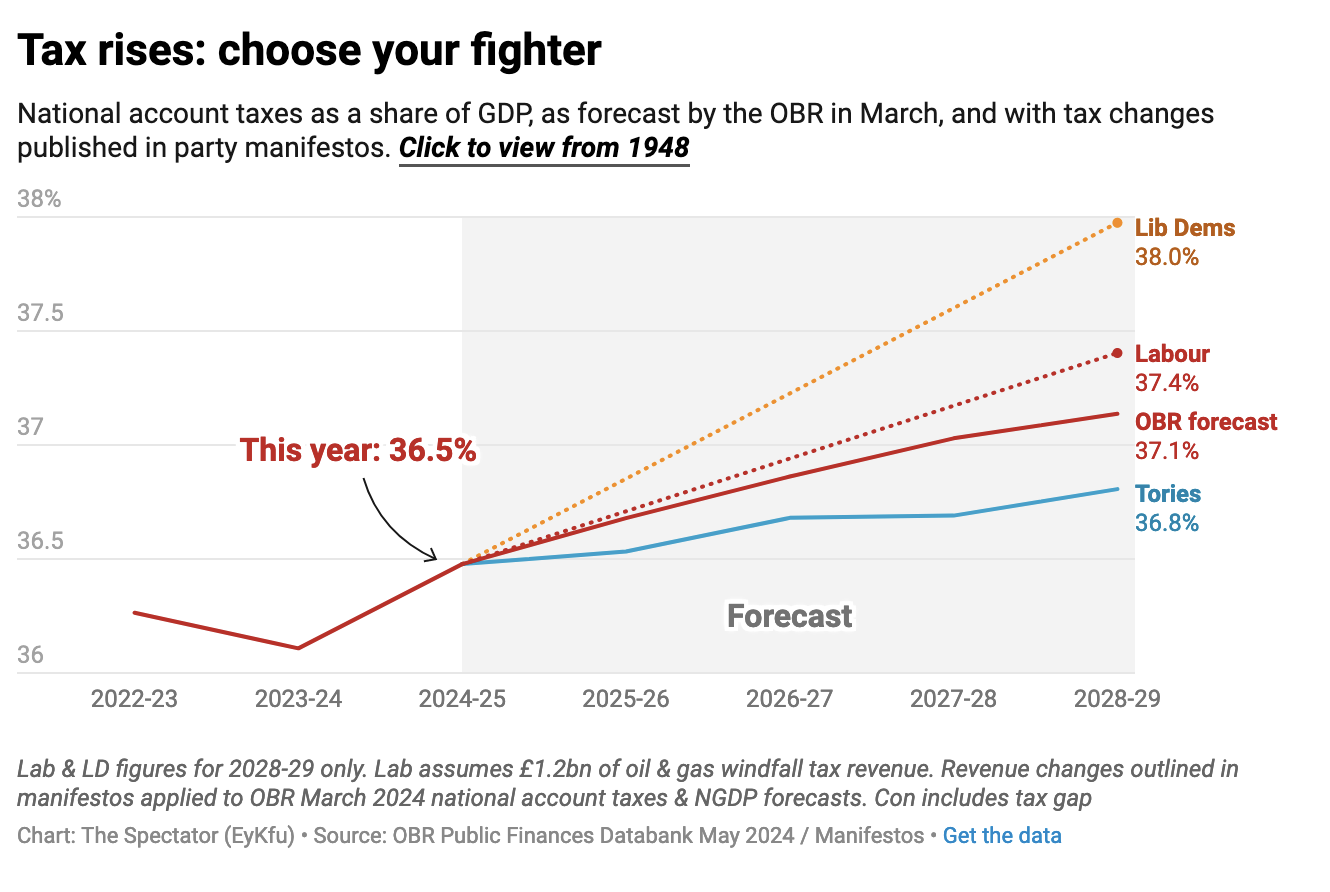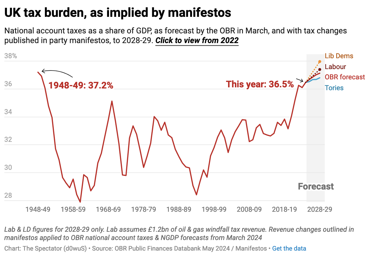 Based only on the figures that Labour has published today, The Spectator’s data hub calculates that the tax burden would rise under a Labour government to its highest level on record. Today’s manifesto would see taxes as a share of GDP rise to 37.4 per cent by 2028-29, surpassing the post-war peak of 37.2 per cent. This compares to the Office for Budget Responsibility’s most recent forecast of 37.1 per cent, and the Tory manifesto, which would see the burden rise to 36.7 per cent.