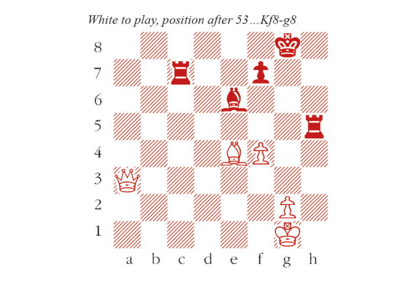 Martinez landed a sharp tactic: 54 f5! Bxf5 55 Bxf5 Kg7 56 Qg3+ winning the rook, so Black resigns (55…Rxf5 would not have helped either).