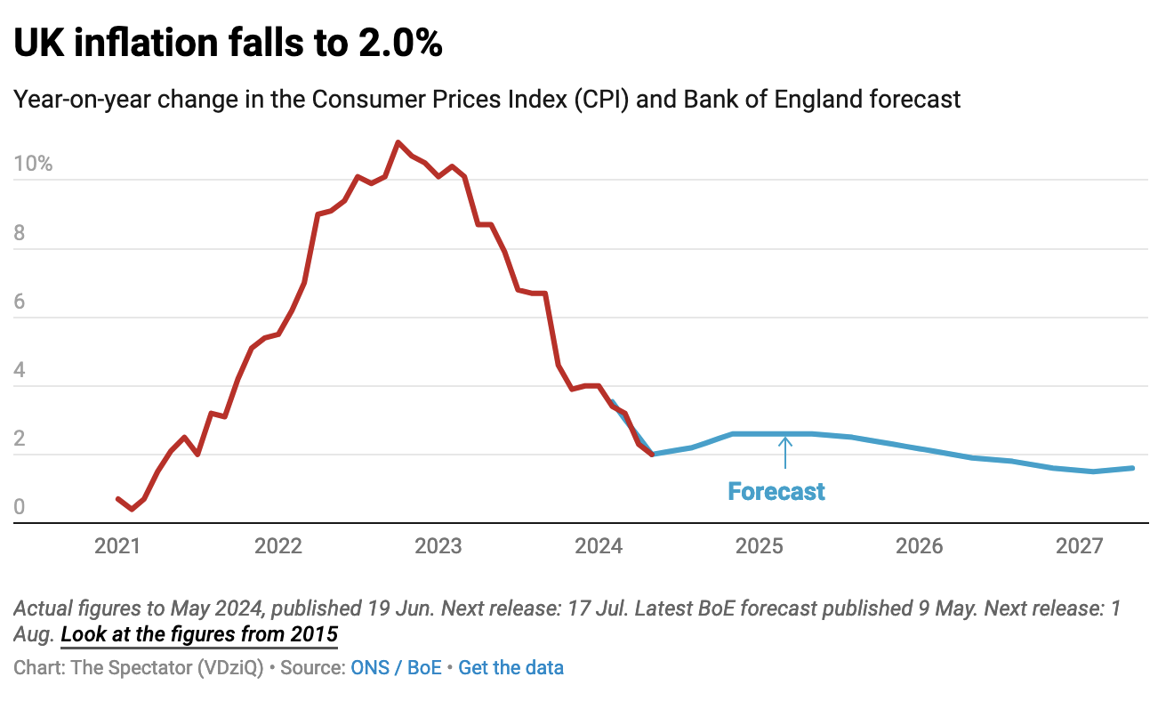 After a three-year saga, inflation has finally returned to the Bank of England’s target. The Office for National Statistics reports this morning that the inflation rate slowed to 2 per cent in the 12 months to May 2024: its lowest point since July 2021.