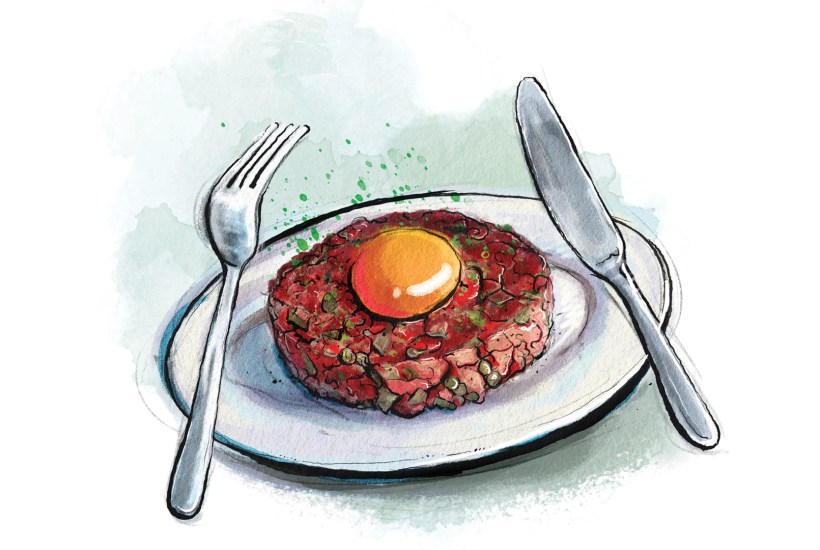 Whenever I think of steak tartare, I can’t help but remember a heartbreaking passage in Nigel Slater’s memoir Toast. Slater, working at a French restaurant in a Midlands hotel as a young man, is desperate to try the steak Diane. He books a table there for himself and a date. In a moment of madness, he accidentally orders the steak tartare instead. Expecting a rich, cream-spiked, butter-fried, brandy-flambéed steak, he is first surprised, and then horrified when a waiter begins chopping up raw meat alongside him. ‘I felt cold, then hot, then cold again. The little egg yolks seemed to be looking up at me, laughing. Then everyone was laughing.’ He goes outside and faints.