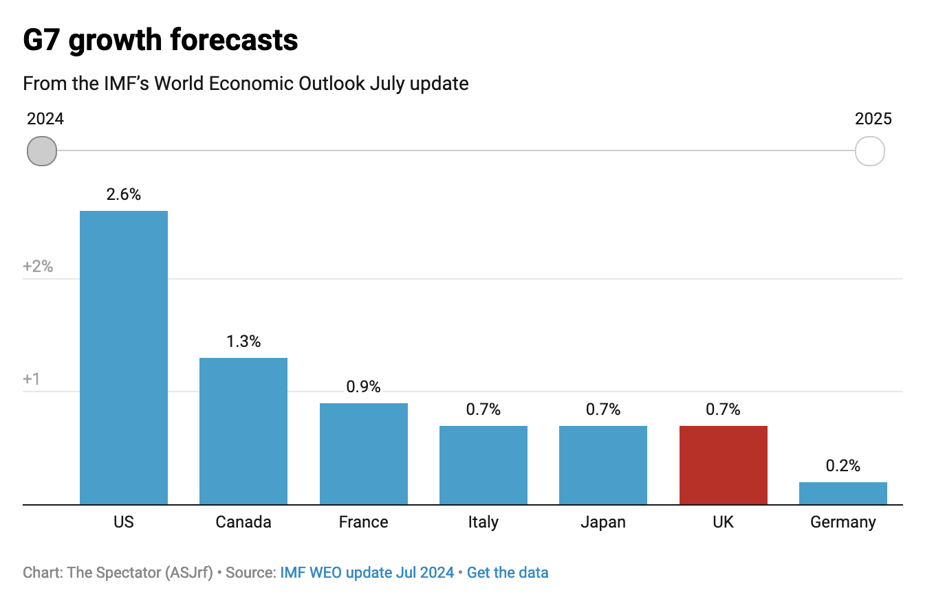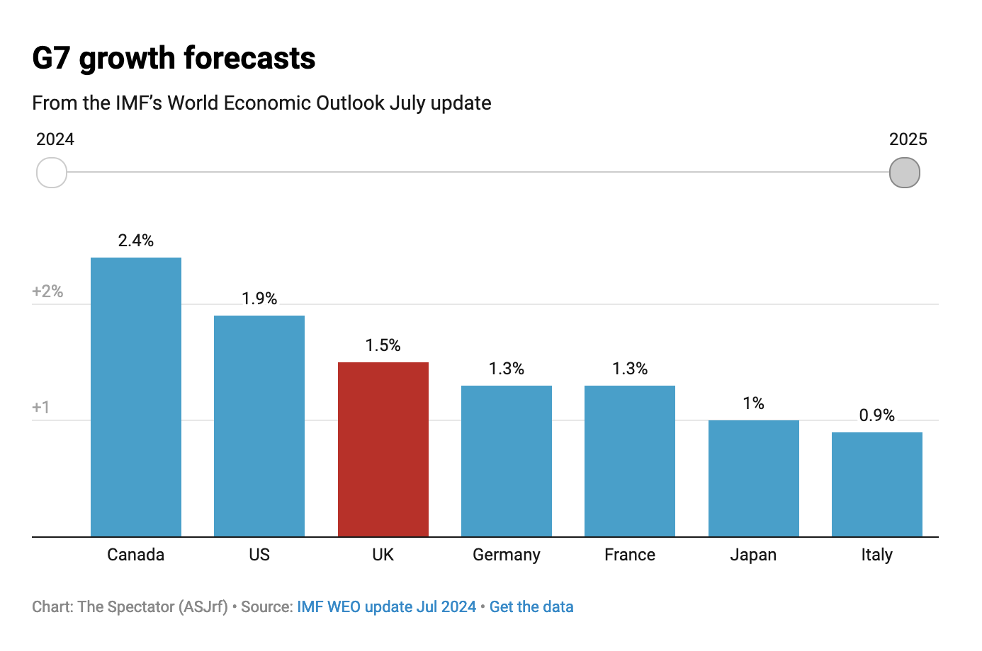 According to the IMF, Britain has gone from being towards the bottom of advanced economy rankings to sitting comfortably in the middle of the pack. This is still far off Labour’s promise to deliver the fastest sustained growth in the G7: the average growth rate for advanced economies this year is estimated to be 1.7 per cent. But it’s better to work your way up to the top from the middle – and Labour are going to benefit from economic updates coming down the track, including the slow and steady reduction in interest rates.