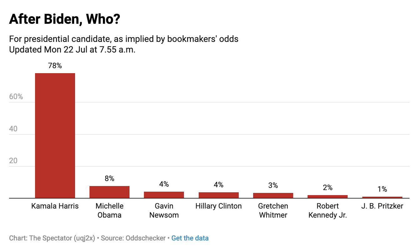 The betting markets think it’s a done deal: the below shows that other possibilities (Gavin Newsom, Whitmer etc) are nothing more than wild outside bets. So let’s focus on Harris.