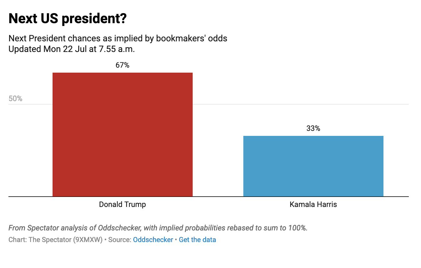 But the idea that dropping Biden will give the Democrats a better chance against Trump has weak support in the studies conducted so far. Whoever the nominee is – and it seems near certain to be Harris – the bookmakers give Trump a 67 per cent chance of taking the White House in November. So markets think that, no matter who the Democratic nominee, this race is very much Trump’s to lose.