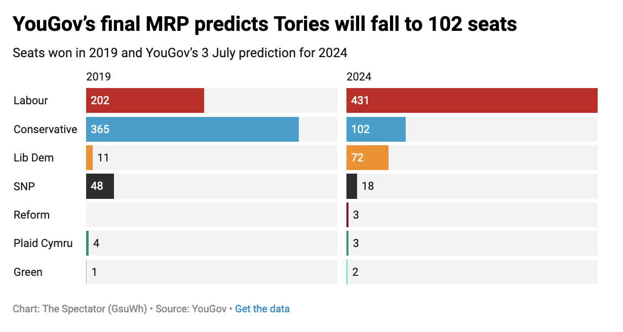 The poll is far from an outlier. If anything, it is more favourable than many. Of course MRP polls take time so the Tories will hope that Reform’s recent stalling in the polls might mean the result tomorrow is more favourable. But ultimately no-one knows. As one Tory aide puts it: ‘The result could be 50 it could be 150 it could be more – the margins are so tight.’ Plenty of campaigners say the feeling on the ground does not reflect the polls. In a day’s time we will find out who is right.