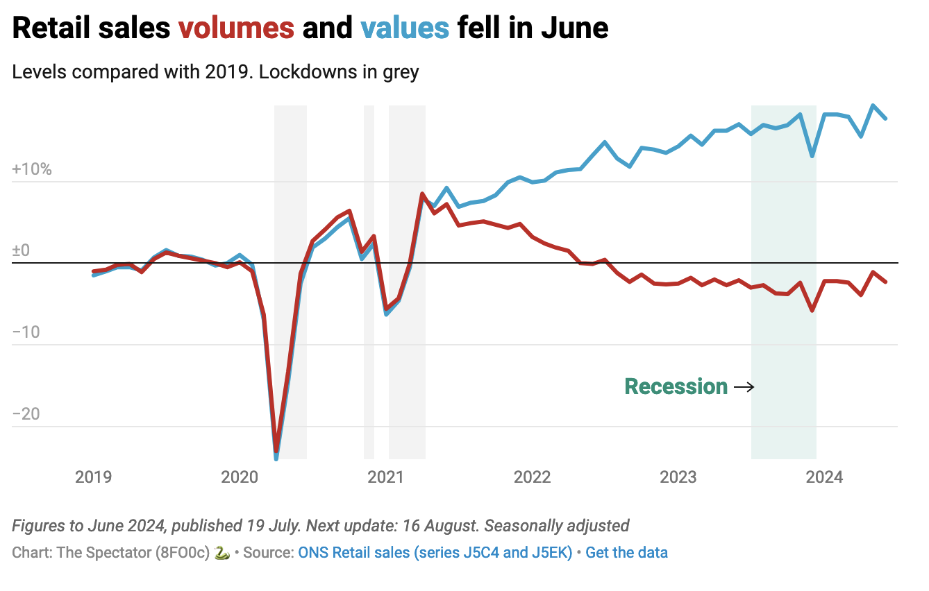 Retailers had things to blame, as ever. The Office of National Statistics suggests they attribute the drop to poor weather and ‘election uncertainty’ (although June was relatively dry in most places compared with other recent months). It is hard to believe that ‘election uncertainty’ played much of a part, either. The outcome was anything but uncertain – although we have yet to see Rachel Reeves’ budget, which may make a difference as to how much money people have in their pockets.