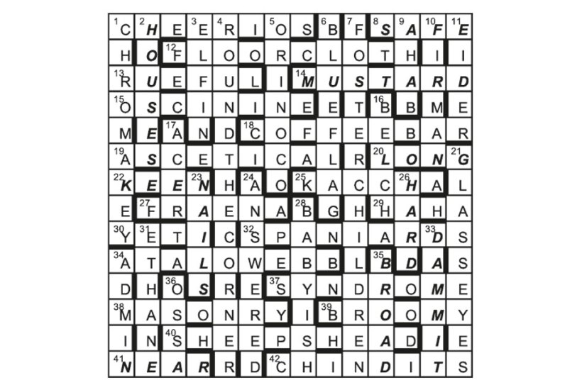 The five unclued pairs were of the form ‘[as] X as Y’, 8/2 SAFE/HOUSES, 22/14 KEEN/MUSTARD, 35/20 BROAD/LONG, 41/33 NEAR/DAMMIT and 26/23 HARD/NAILS.