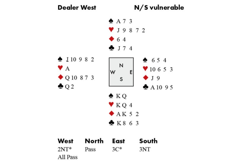 West’s little toy showed five-five in two unknown suits (yes, apparently that’s still legal in some parts of the world), and East’s 3♣ just asked to bail out as soon as possible. What was Mikael to do but overcall Sweden’s favourite bid – 3 NT?