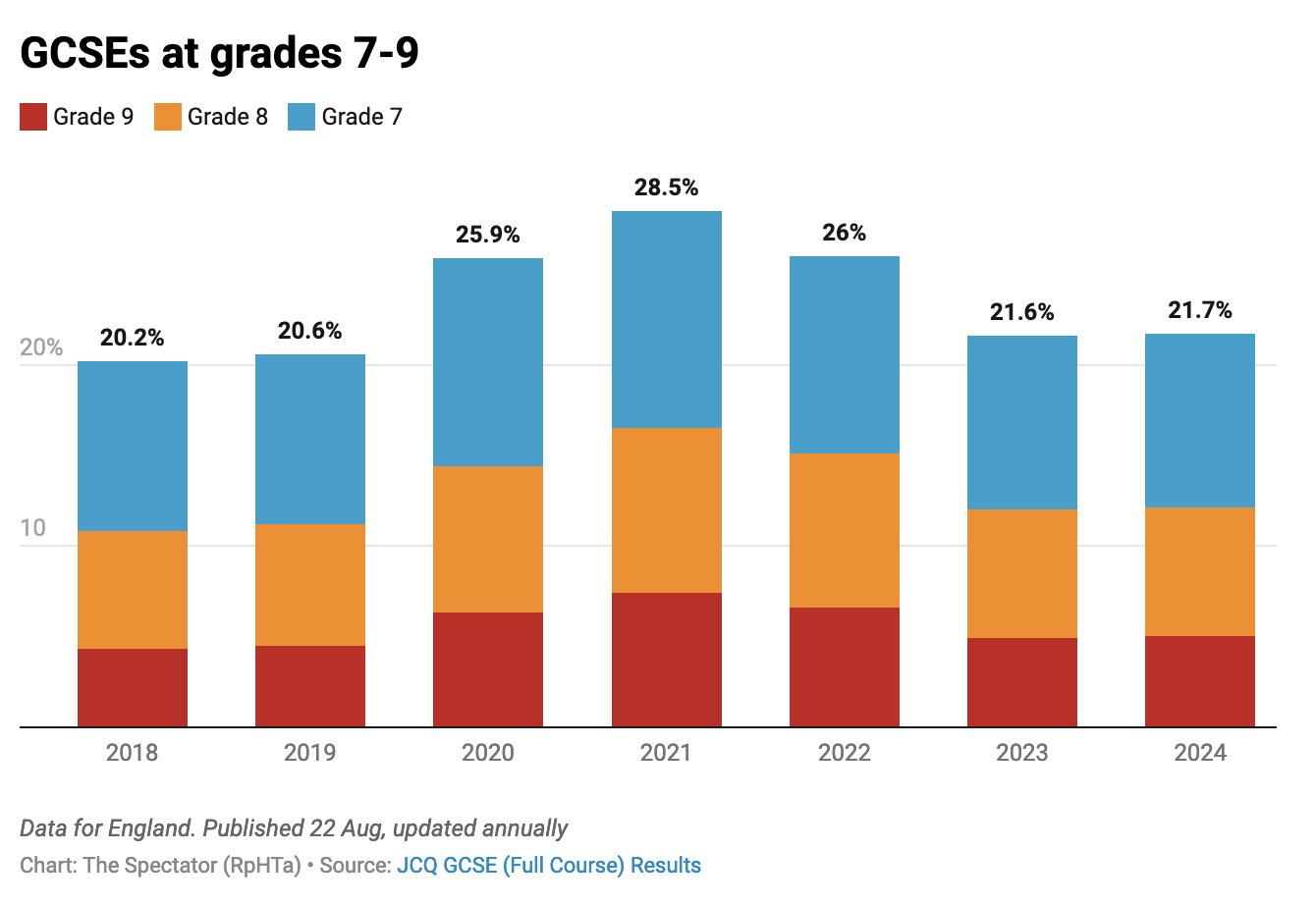 Today’s GSCE results show essentially unchanged performance compared with last year, with 21.7 per cent of pupils achieving grade 7 or above (compared with 21.6 per cent in 2023) and 67.4 per cent achieving grade 4 or above (compared with 67.8 per cent last year). This is still slightly up on 2019, but the Covid bounce in grades which occurred in 2020 and 2021, when exams were not actually sat and pupils were awarded grades based on teachers’ predictions instead, seems to be over. In 2020, 75.9 per cent of candidates achieved grade 4 and above, rising even further to 76.9 per cent in 2021. The pandemic effect lasted into 2022, when 73.7 per cent achieved grade 4 or above, but had been all but eliminated by last year.