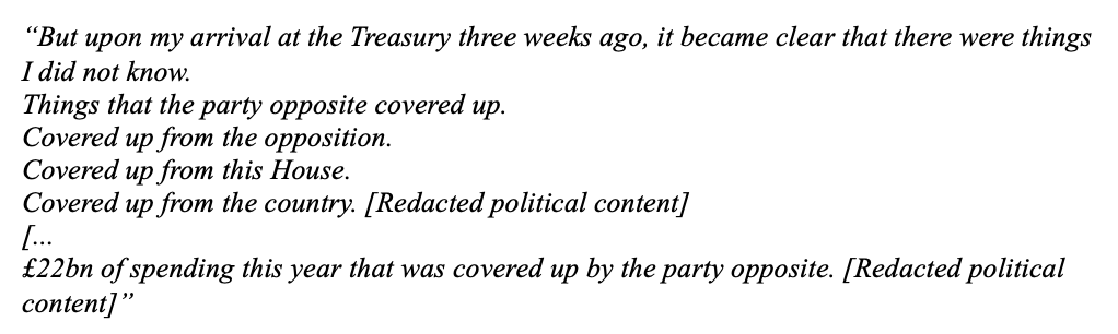 Baroness Neville-Rolfe was rather unimpressed with his response, describing the ‘incorrect, or at least misleading’ parliamentary answer as seeking to ‘brush this breach of the civil service code under the carpet’. In a letter sent today seen by Steerpike, noted her own rather fascinating investigation into the matter. Pointing out that the original version – which can be accessed via an online archive – had already been ‘partly redacted’, the Conservative peer pointed to how certain party political statements had rather curiously remained. Giving examples of retained political statements – including a line that claims the former Tory government ‘covered up’ financial details from ‘this House’ and ‘the country’ – she wrote: ‘Clearly, a choice had originally been made to remove some content, but to keep in other political lines.’ It certainly looks that way…