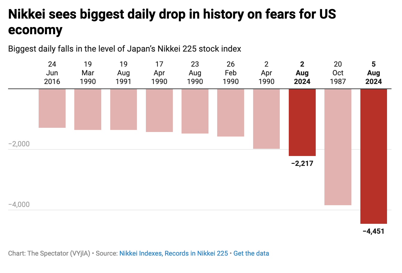 Are we out of the woods? Not quite. A leading Wall Street Bank – BNY Melon – this morning warned that global markets would be in turmoil for ‘months’. Earlier in the week, Japan’s share price falls were followed by some brutal sell offs in the US and Europe, with the microchip giant Nvidia seeing the worst of it: sales wiped out most of the gains on European markets from the past few months. As the week wore on, markets recovered some of those losses and things looked to be stabilising. But the week is ending with a renewed sense of fear.