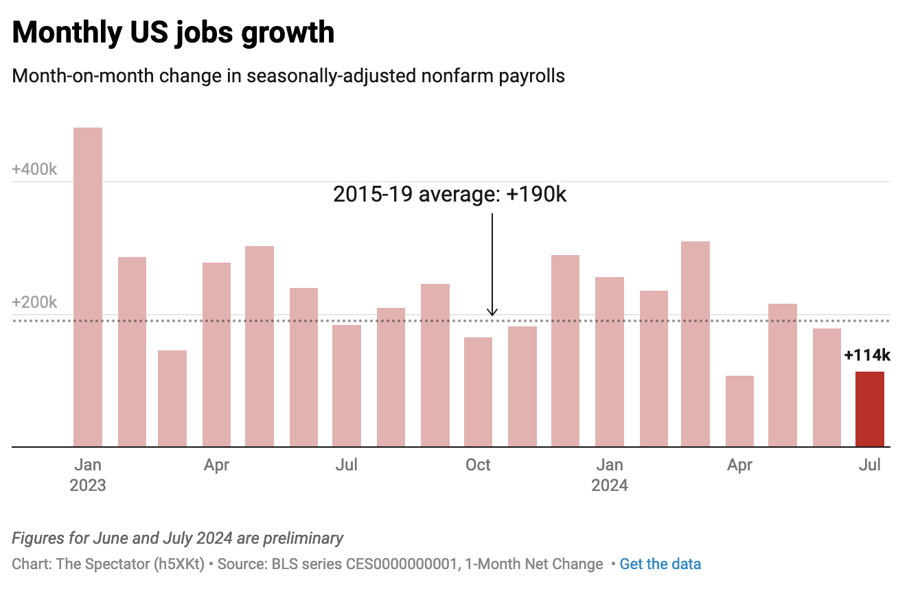 But what caused the fears this week? US job creation data, which came in much lower than expected – with just 114,000 new jobs added to payrolls. This was then compounded by the unemployment rate spiking at 4.3 per cent which, as Kate Andrews wrote on Coffee House, is what seems to have caused fears that positive US growth forecasts for this year now look far too optimistic. However, there was better news from across the pond: US benefit figures yesterday showed claims for joblessness benefits falling at their fastest pace in nearly a year. This reassured investors that things were perhaps not as bad as they seem. The Dow Jones average of industrial stocks rose half a per cent at the open while the S&P 500 rose by 1 per cent. A mixed picture.