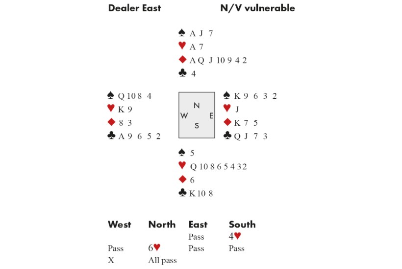 North expected a bit more from a second-in-hand vulnerable 4♥ opening and jumped to slam. West figured she probably had a trump trick in addition to her Ace, so gave it ‘the message’, but this was seriously unsound, as we shall see.