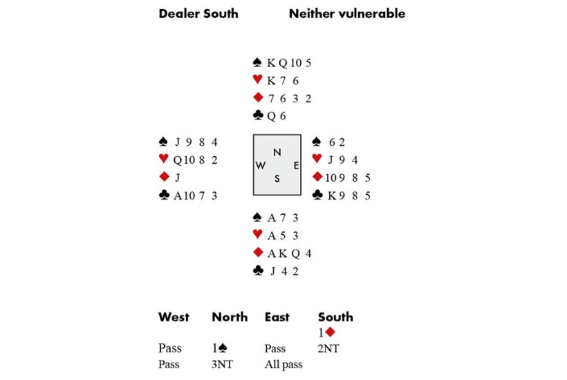 West led the ♥️2 to East’s ♥️J. Alice ducked, won the heart continuation, and cashed two diamonds. When West showed out (pitching a club), she stopped to think. She had eight top tricks, and the best chance for a ninth was from spades. West’s lead was ‘fourth highest’, so (unless it was a false-card), he’d begun with four hearts and one diamond. Should she play spades to be 3-3? The answer lay in what West didn’t lead: a club. He would surely have led one from five, meaning his probable shape was 4414. Alice cashed the ♠️K, then the ♠️A, and confidently finessed the ♠️10 – contract made.