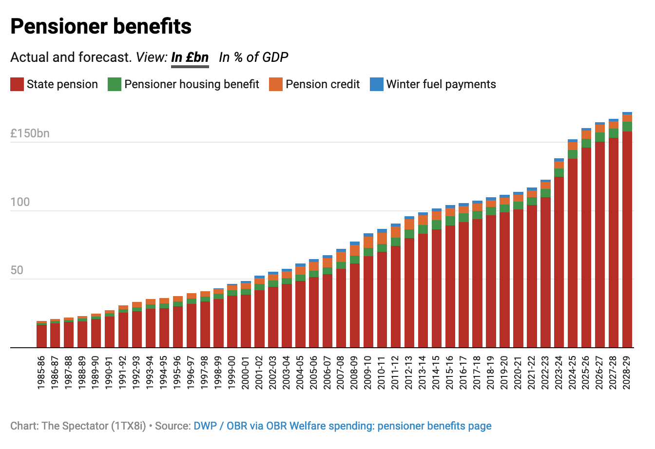 £152 billion is a big number. That’s the total value of welfare payments to pensioners in 2024/25. It’s more than we spend on the NHS. Taking the £1.4 billion annual cut into account, by 2027, that total bill will be around £166 billion.