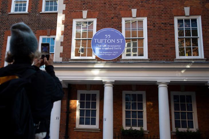 The blue plaque that Donkeys erected outside 55 Tufton Street – ‘the UK economy was crashed here’ – was attached to a wall out the back at the exhibition space. While the organisers proudly claimed that ‘all the materials displayed were created at the time of the interventions, then either returned, reclaimed or never deployed’, there was little more to see that justified the long wait to enter the building.