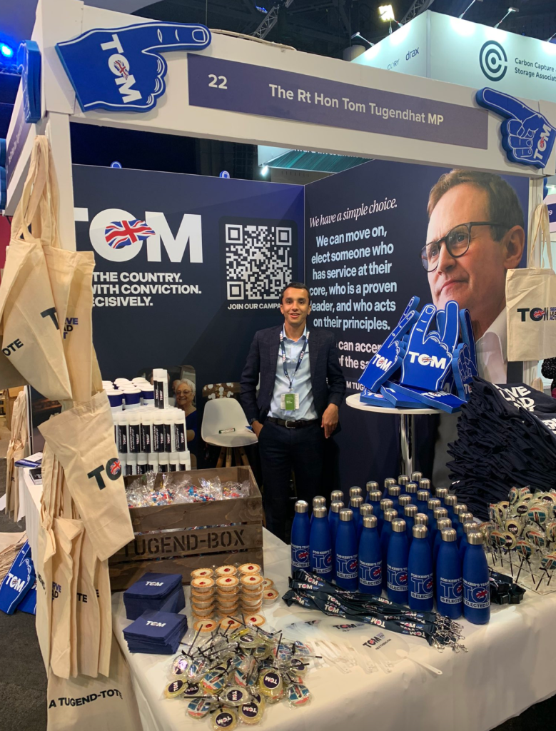 The stand with the most merch, it seems Team Tugendhat has had an absolute whale of a time thinking up things to give out to members. There are ‘tugentarts’, ‘tugentote bags’ and even ‘tugentan’ for any activists feeling a bit pale in the Birmingham rain. But Mr S enjoyed the water bottles the most: ‘For Keir’s tears’, it says ‘When Tom is elected leader.’