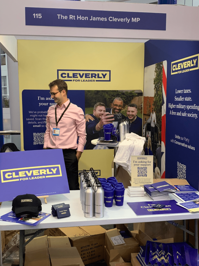 As the name suggests, Cleverly’s stand certainly has some clever wordplay. There are power packs brandishing the slogan ‘Power to our members’ and wallets with ‘Lower taxes’ written on. Water bottles say that there are ‘No leaks here’ while the coffee cups say ‘Caffeinate with Cleverly.’