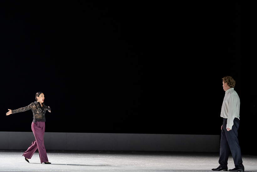 Russophiles have grumbled for years about the way Tchaikovsky trimmed and tidied Pushkin’s raffish first-person narrative into seven self-contained ‘lyrical scenes’. From the start, Huffman seems determined to tug and tear at those graceful patchwork pieces; to unpick the opera’s relationship with its source material, and with us, its audience. The setting (if you can call it that) is determinedly contemporary and monochrome. There’s swirling mist instead of scenery and everything plays out against one of those black backdrops that look cool in the production photos but give you eyestrain over the course of an evening.