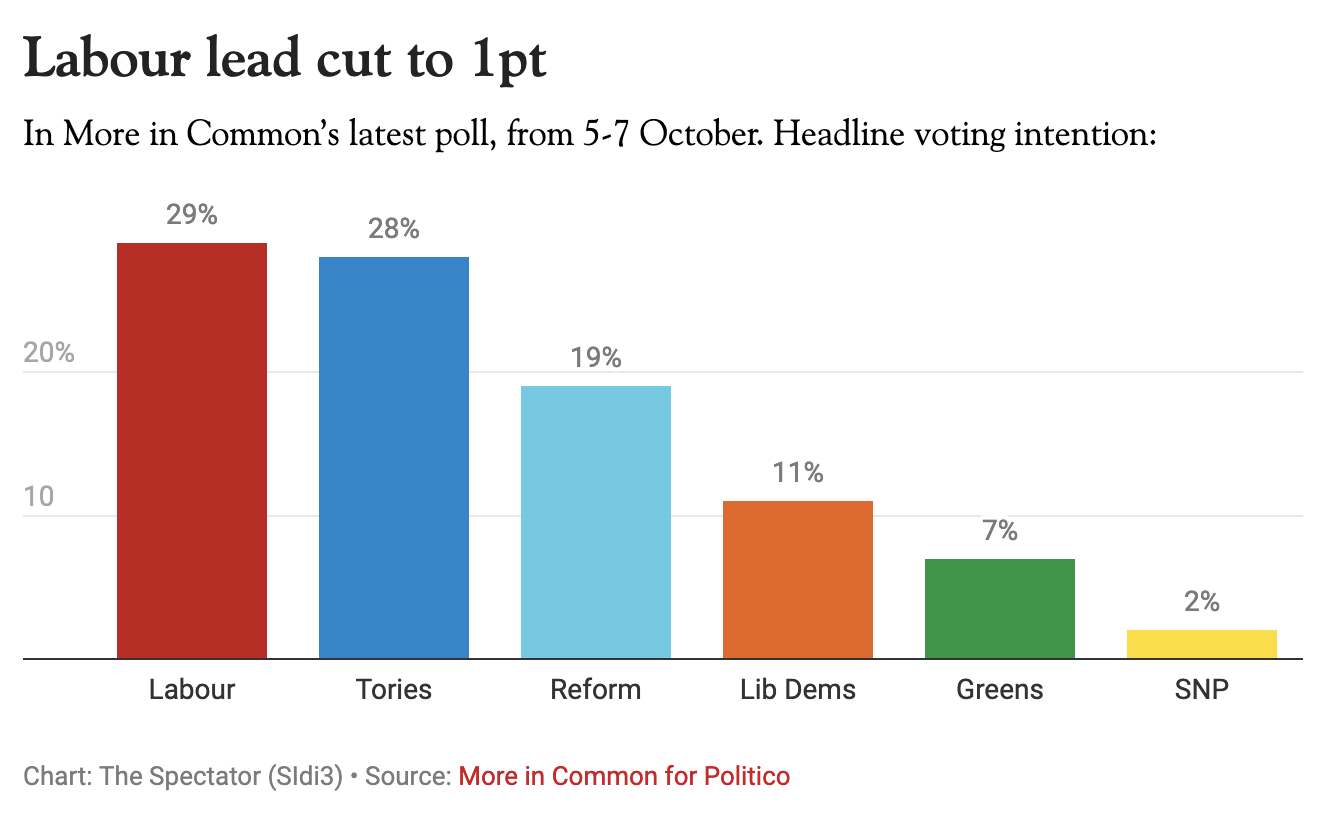 When it rains for Sir Keir Starmer, it pours. Polling by More in Common via Politico has revealed that Labour’s lead has been dramatically slashed to just one point ahead of the Tories, only three months after Labour’s landslide win.