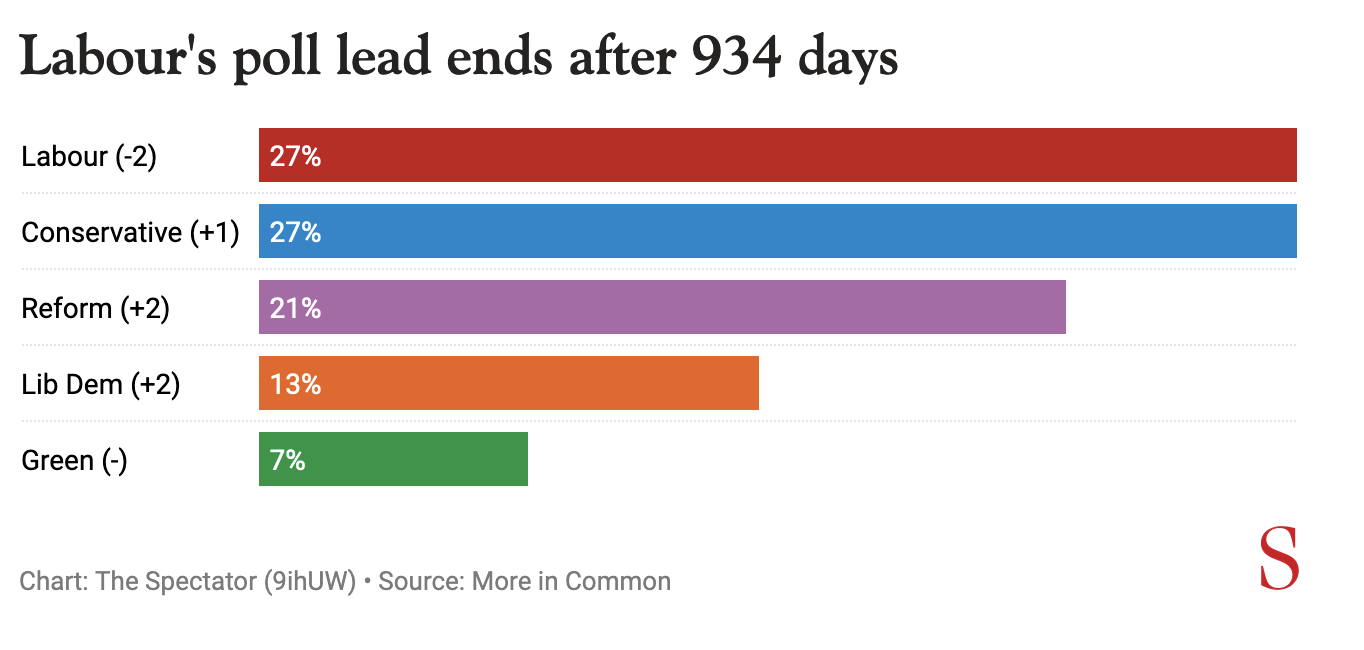 Happy 100 days of Labour being in power! To mark this auspicious occasion, the British electorate have decided to give Keir Starmer a present that he really did not want – the end of Labour’s lead in the polls after a whopping 934 days. Yes, that’s right: the Starmer army have led in every single survey since March 2022 when Boris Johnson was gripped by his partygate woes. The subsequent Liz Truss debacle saw Labour’s lead climb to 30 points, with Rishi Sunak regularly suffering 20 point deficits. Yet after less than four months in office, that trend has now been completely reversed. Guess governing is harder than it looks eh Keir…