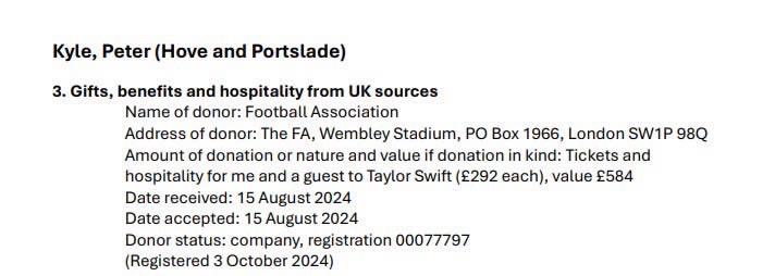 Members of parliament have 28 days to register gifts – yet Kyle registered £584 worth of Eras tour tickets almost 50 days after receiving the extravagant donation. The Science Secretary received the tickets from the Football Association on 15 August, however it took him until 3 October to log the perk. How curious.