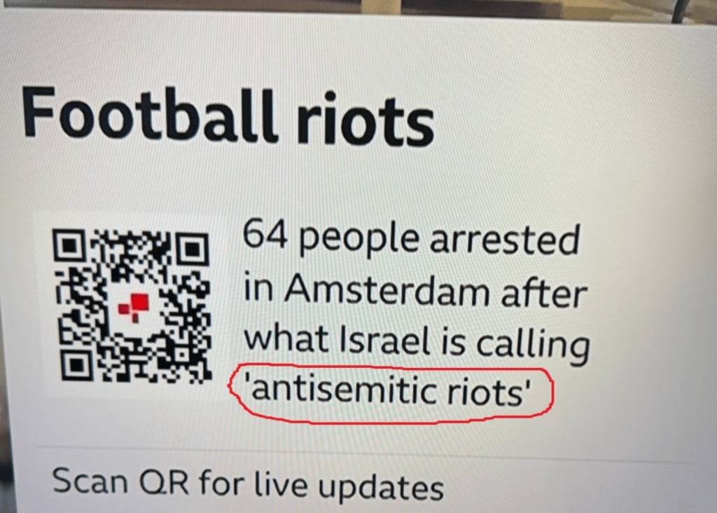 The BBC’s live blog has received criticism for noting: ‘Before the match, there was trouble between Maccabi fans and pro-Palestinian protestors.’ It also highlighted as a main bullet point that: ‘Maccabi supporters attacked a taxi and set a Palestinian flag on fire. There are also reports of supporters chanting racist slogans about Arabs.’ However none of the other main bullets actively condemned the attacks on Israeli fans. How very curious…