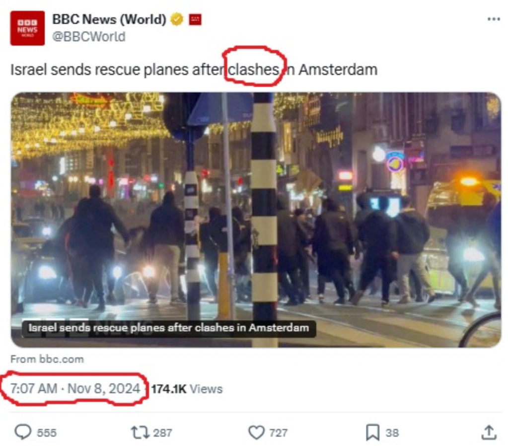 A single short post on a live page which has been running for several hours cannot and does not represent the entirety of BBC coverage on the subject. The live page, which has been headlining throughout on Israeli fans being attacked, includes detailed reports of these incidents, with some posts based on single-source testimony, for example one from a Maccabi fan who describes being attacked. The BBC’s job is to report this story impartially, taking in all the context and testimony – this includes looking at user-generated content to build a full picture of how the events unfolded.