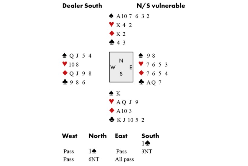 In fact what declarer did was cross to the ♥️K and play a club. I won with the ♣️A and continued a diamond. Had I played a spade, as perhaps I should, I would have broken up the squeeze. Declarer won with the ♦️A, and ran hearts and clubs, ending with ♠️K, ♦️10, ♣️2. Poor Guy was down to ♠️QJ ♦️J. On the last club, he was squeezed. He pitched the ♦️J and declarer, looking dumfounded, cashed the ♦️10. ‘I was squeezed, well done,’ said Guy. ‘Actually I only had the singleton ♠️K,’ she said kindly, ‘but you weren’t to know.’