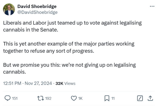 Liberals and Labor just teamed up to vote against legalising cannabis in the Senate.