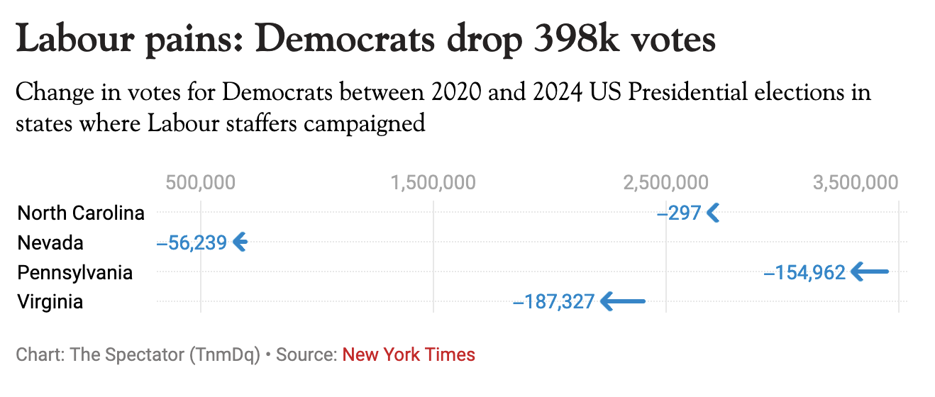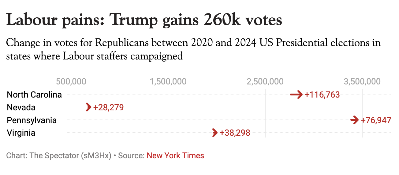 Indeed, everywhere that Labour sent its activists, Trump made huge gains. He won an extra 28,000 in Nevada, 38,000 more in Virginia, 77,000 in Pennsylvania and a whopping 117,000 in North Carolina. Republicans might decry foreign election interference but with those numbers they ought to be begging Starmer to send his legions again in four years’ time.