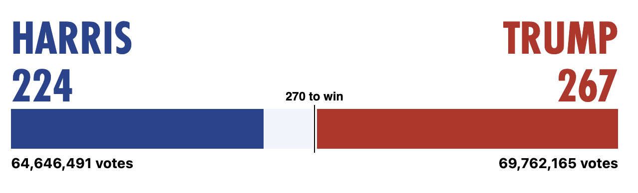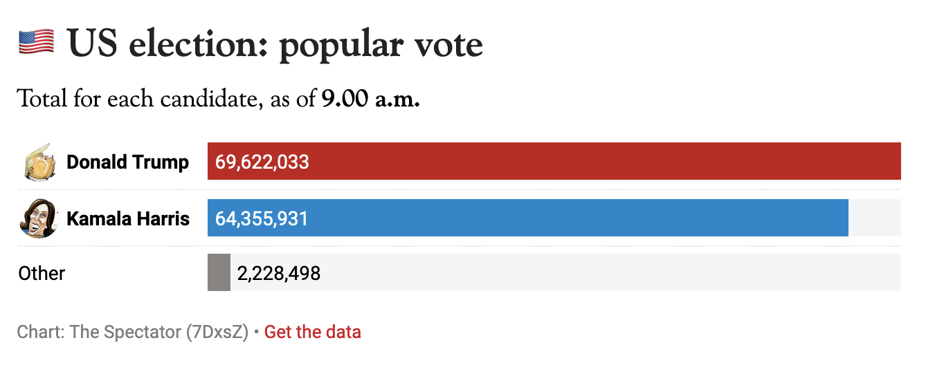Donald Trump has declared victory in the US election after winning the key battleground states of Pennsylvania, North Carolina and Georgia. ‘America has given us an unprecedented and powerful mandate,’ the Republican candidate told supporters. ‘This is a magnificent victory for the American people, that will allow us to make America great again,’ he said at the rally in Florida. Trump has still not secured the 270 Electoral College votes he needs to confirm victory, but the path to the White House looks increasingly narrow for his Democrat rival Kamala Harris.