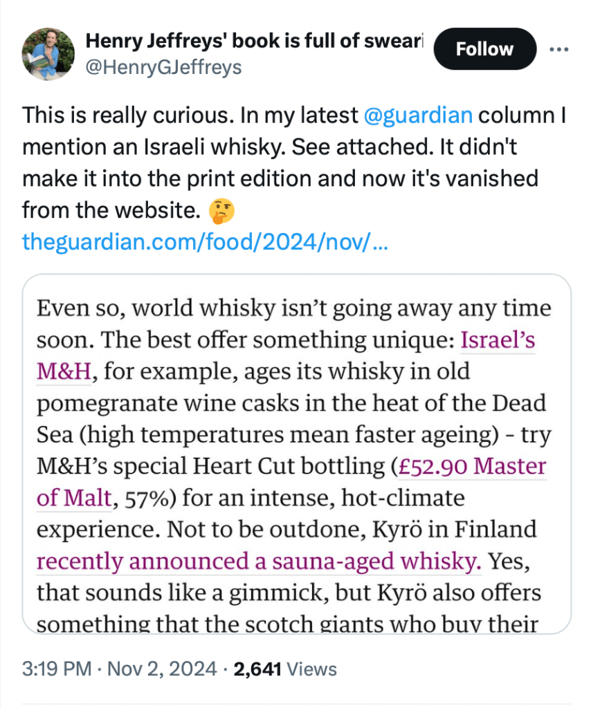 Well, well, well. It seems that the Guardian, the self-proclaimed bastion of ‘clarity and imagination’, has been acting rather censoriously of late. It transpires that, in a column navigating the world’s great whiskies by wine critic Henry Jeffreys, a reference to an Israeli single malt whisky was first removed from the print copy – before subsequently being deleted from the online version. How very curious.