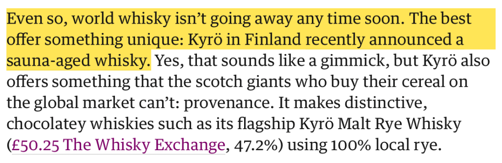 Yet now the online copy is distinctly different. It reads: ‘Even so, world whisky isn’t going away any time soon. The best offer something unique: Kyrö in Finland recently announced a sauna-aged whisky.’ How very bizarre.