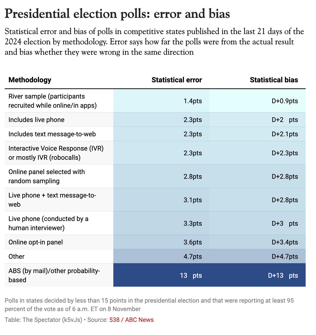 Pollsters spent an estimated half a billion dollars (£388 million) on this election, but most polling methods were still biased towards Kamala Harris by around three percentage points. One method – recruiting participants by mail – managed to be wrong by a whopping 13 points. Another, recruiting participants while they were online or using an app, was only off by around one point.